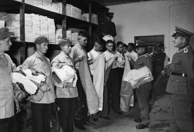 Rekruci z rocznika 1914 r. odbierają mundury drelichowe w magazynie odzieżowym.