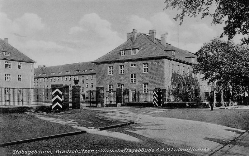 Koszary AA 9 w Lubinie – widoczne budki wartownicze, bydunek sztabowy, budynek mieszkalny strzelców motocyklowych, budynek gospodarczy.