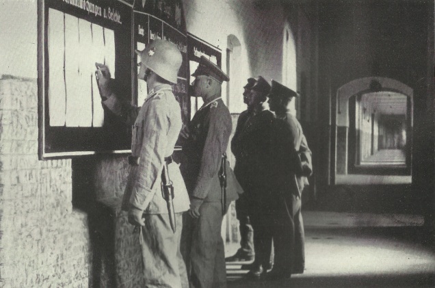 Żołnierze przy schwarzes Brett — tablicy informacyjnej.